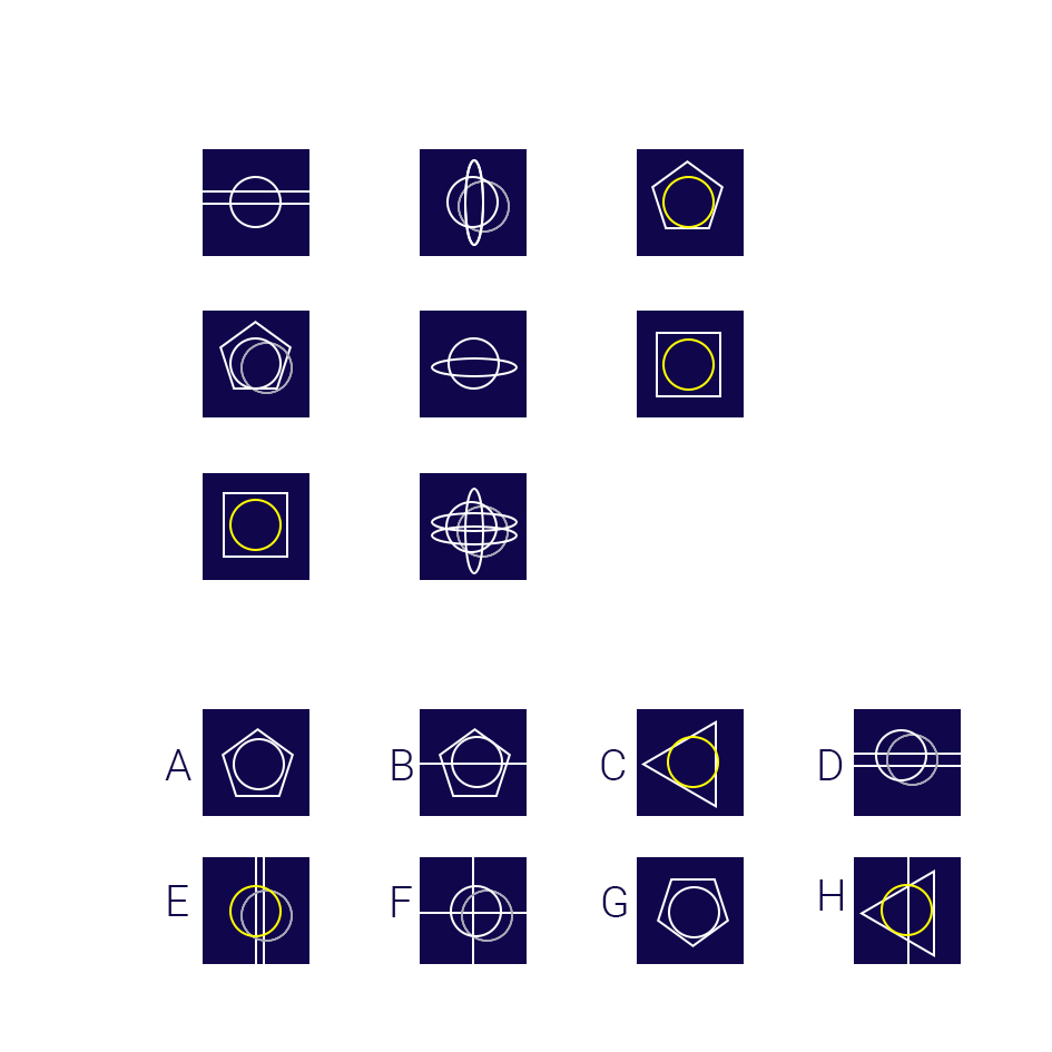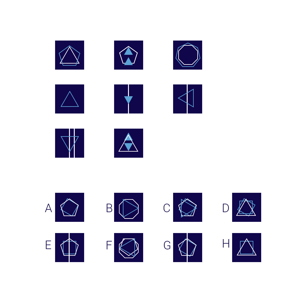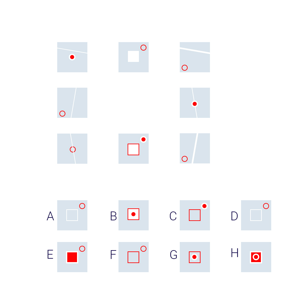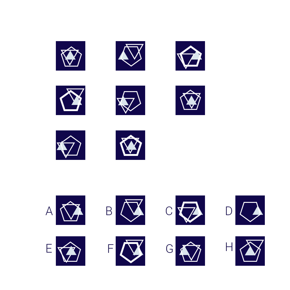 The Spatial Test SOFIA contains 20 items designed to measure spatial reasoning, pattern recognition, and the ability to mentally manipulate geometric transformations.There is no time limit, but test-takers are encouraged to spend between 1 and 2 hours completing all items in a calm and focused environment. Accuracy and reasoning clarity are more important than speed.